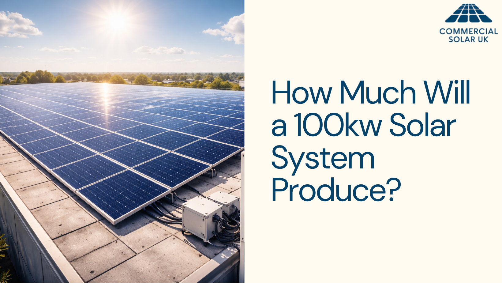 A 100 kW solar system typically produces about 80,000 to 100,000 kWh per year in the UK. This equates to roughly 220 to 275 kWh per day on average.